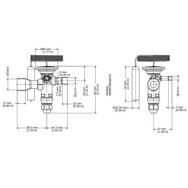 Danfoss 067N3154 6.5TR Thermostatic expansion valve, TGE, R410A,R32, 1/2x7/8 in Solder, ODF, 1/4 in Externally equalized, Bi-flow, -40 to 50 F replaces 067N3174