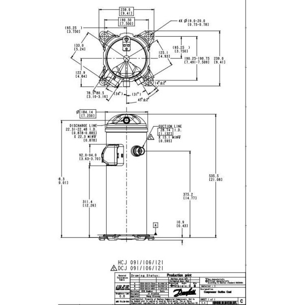 Danfoss DCJ091T2LC6A DCJ091T2LC6 7.5 tons 91,000 btu/h R410A Scroll compressor for Air conditioning 208-230/3/60 (V/Ph/Hz) Discharge 7/8 in, Suction 1-1/8 in, ODF, PVE Oil 121L5003 Replaces 121L5002, 120U2307, 121L8589, HCJ090T2LC6A