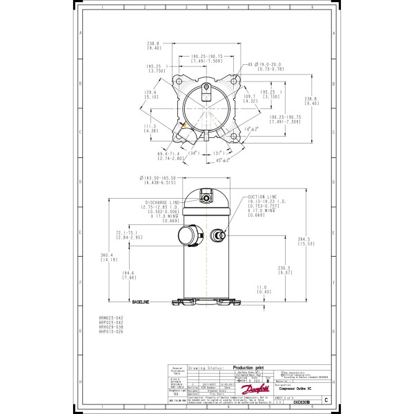 Danfoss HRH038U4LP6 3.2 tons 38,000 btu/h R410A Scroll compressor for Air conditioning 380-415/3/50, 460/3/60 (V/Ph/Hz) Discharge 1/2 in, Suction 3/4 in, ODF, PVE Oil 121L1206, 121L1203