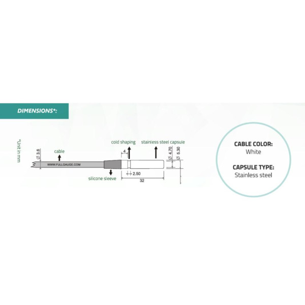 Full Gauge SB-59 NTC Temperature Sensor 8.2 ft (2.5 m), NTC Sensor with silicone cable and covered with stainless steel shell. Operating Temp -58 to 392 F (-50 to 200 C)