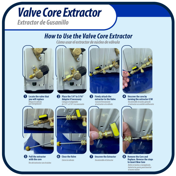 Como Funciona: Conecte firmemente la herramienta a la valvula que se va a reemplazar, desenrosque el nucleo de la valvula y extraigala. Cierre la valvula y desenrosque el extractor. Recupere y reemplace el nucleo. Inserte la herramienta extractora. Abra la valvula. Atornille el nuevo nucleo de la valvula. Recupera la herramienta