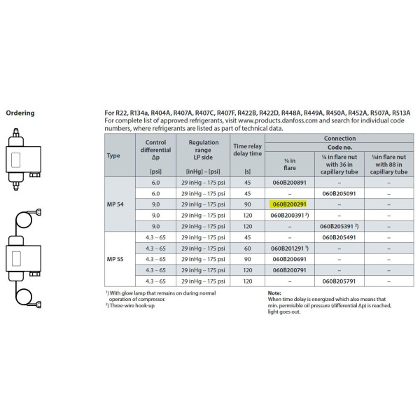 Los interruptores de presion diferencial MP 54 y MP 55 se utilizan como interruptores de seguridad para proteger los compresores de refrigeracion contra baja presion de aceite lubricante. Si la presion de aceite falla, el interruptor detendra el compresor despues de que haya transcurrido un tiempo predeterminado.